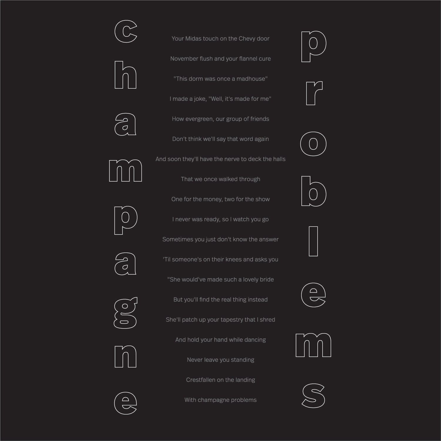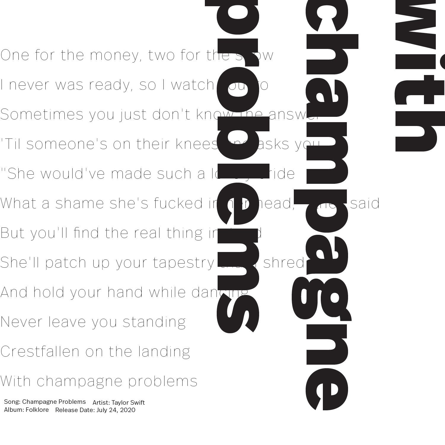 In this project, we were asked to pick a body of text and create typography-based layouts. For my text, I chose Taylor Swift's song champagne problems featured on the evermore album.