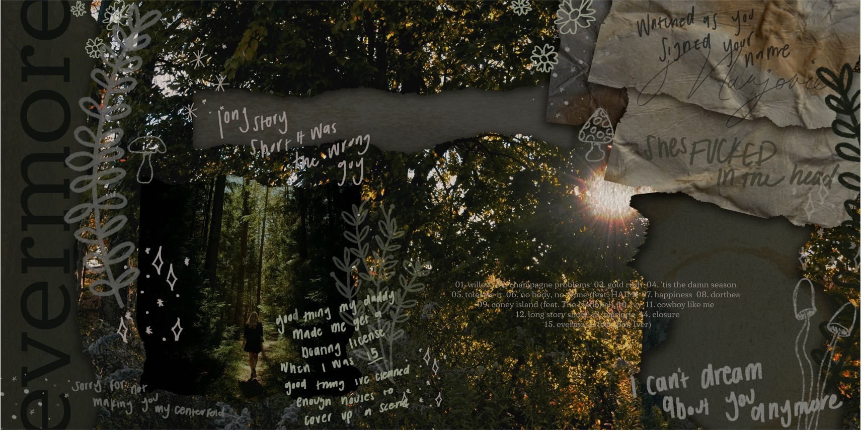 As a continuation of the first project in this class, I chose to create a vinyl design for the evermore album. This vinyl is a gatefold style with inspiration from a diary/scrapbook design.