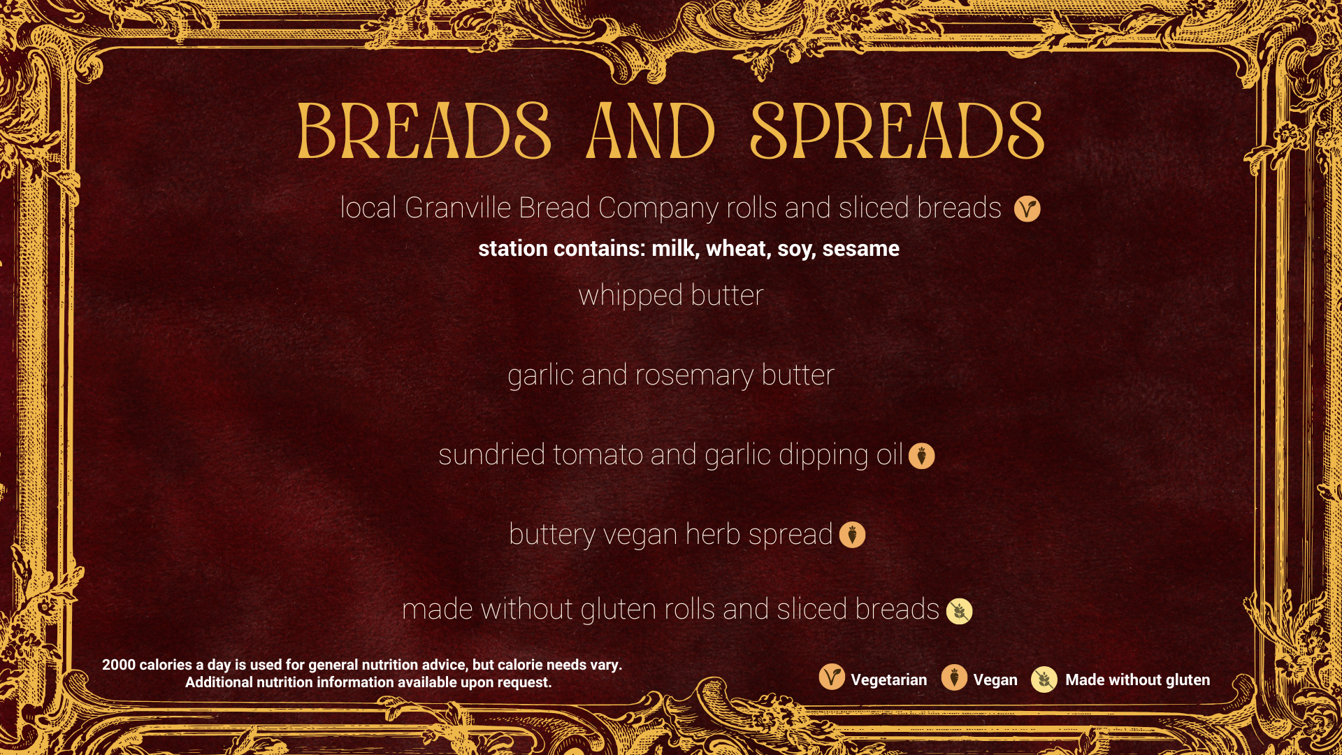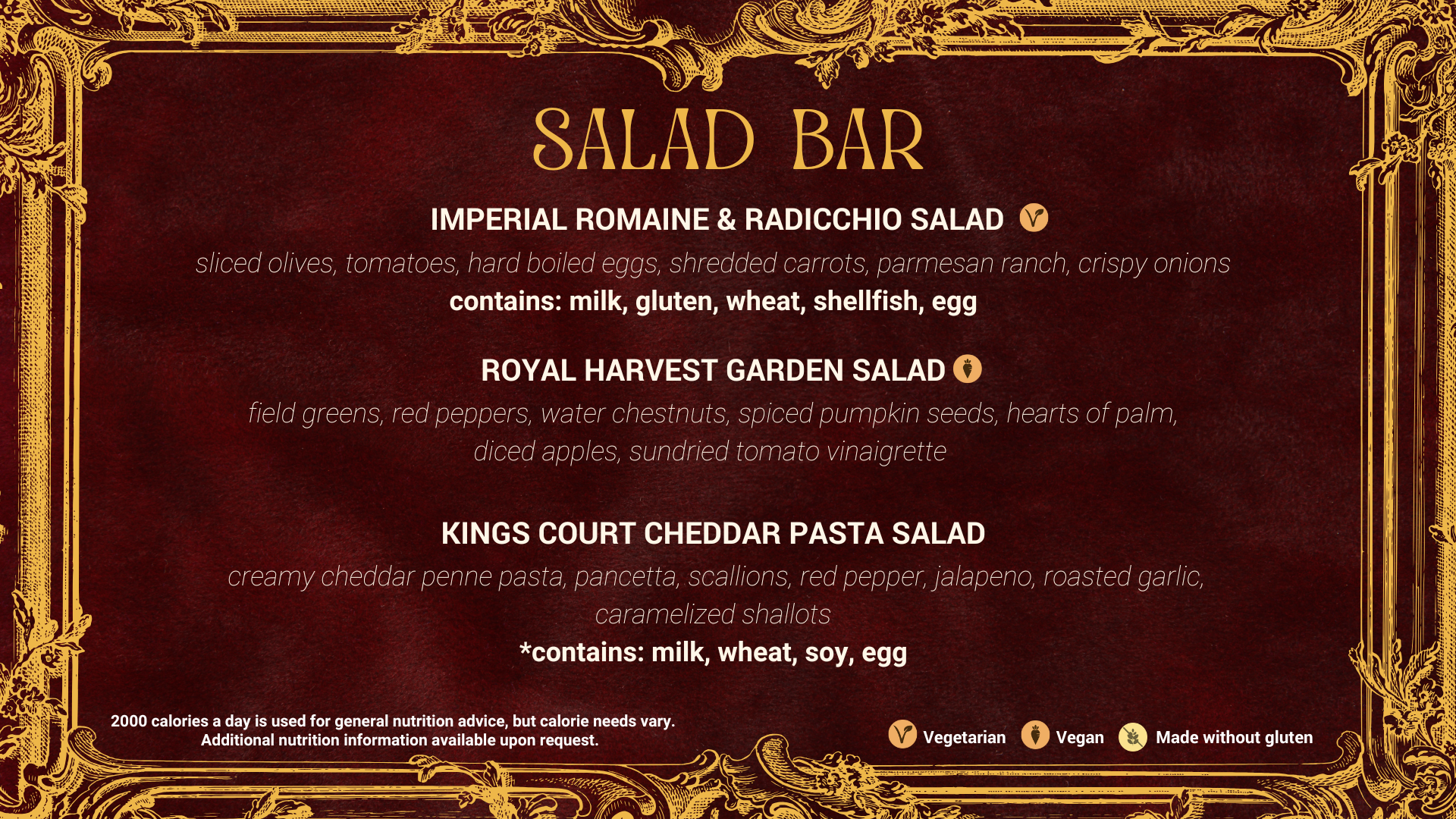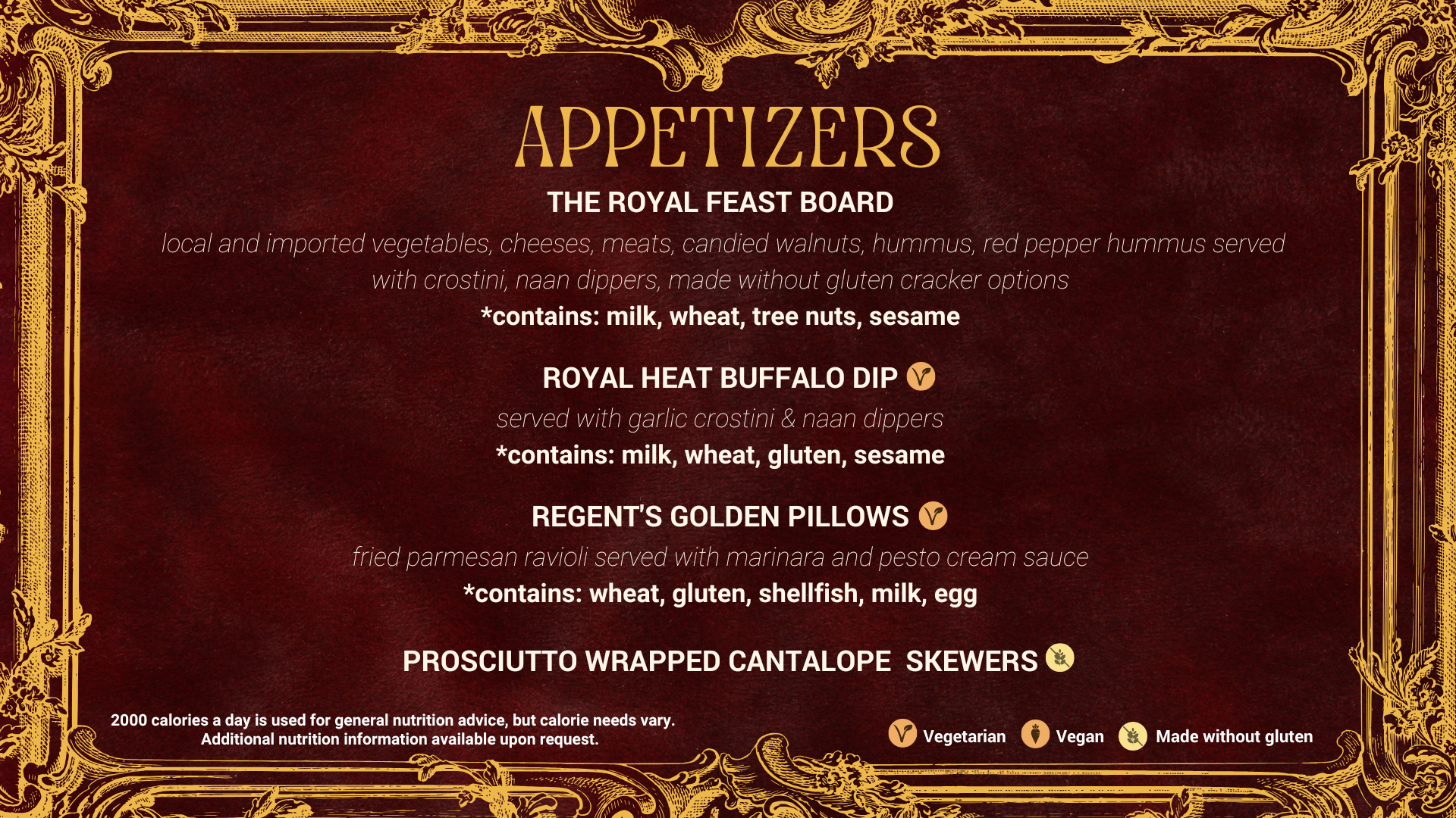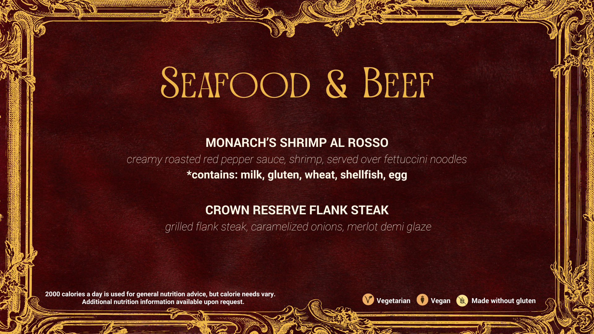 Below: Menu board templates for the Denison University Programming Council 2026 Royal Ball Gala.