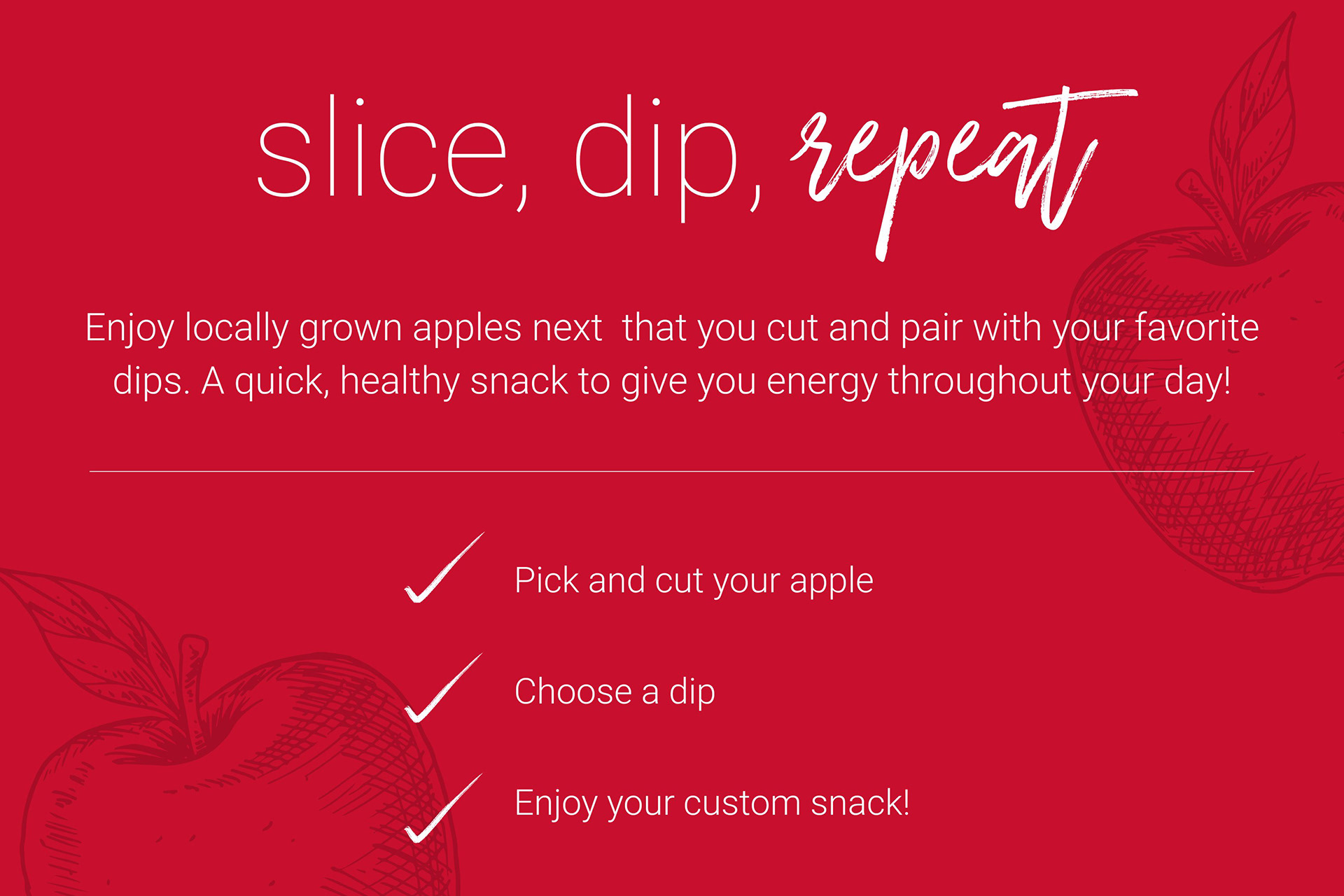 Below: The Table at Huffman team requested that signage be added to their apple cutting station after students requested this station to be added last spring. The goal was to explain the purpose of the station, provide steps through the experience, as well as shout out the partnership we have with local farms.